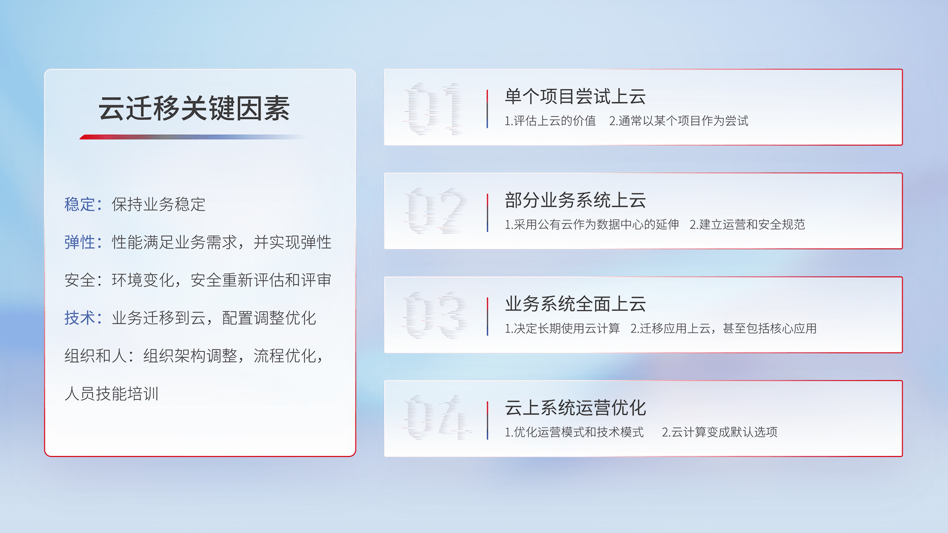 结合实际业务,,,,从规划设计、、、云平台选型、、、云原生改造、、、数据迁移、、、、集成交付,,迁移全过程为客户识别最佳上云路径,,,,做好风险识别管理,,,设计网络架构、、、、身份权限、、、安全审计合规、、、、操作审计、、、日志审计、、监控告警策略、、多站点容灾设计等,,,,对云上基础设施进行整体规划,,提升IT治理水平,,,以满足弹性、、、、高可用、、、高性能的需求。。。。