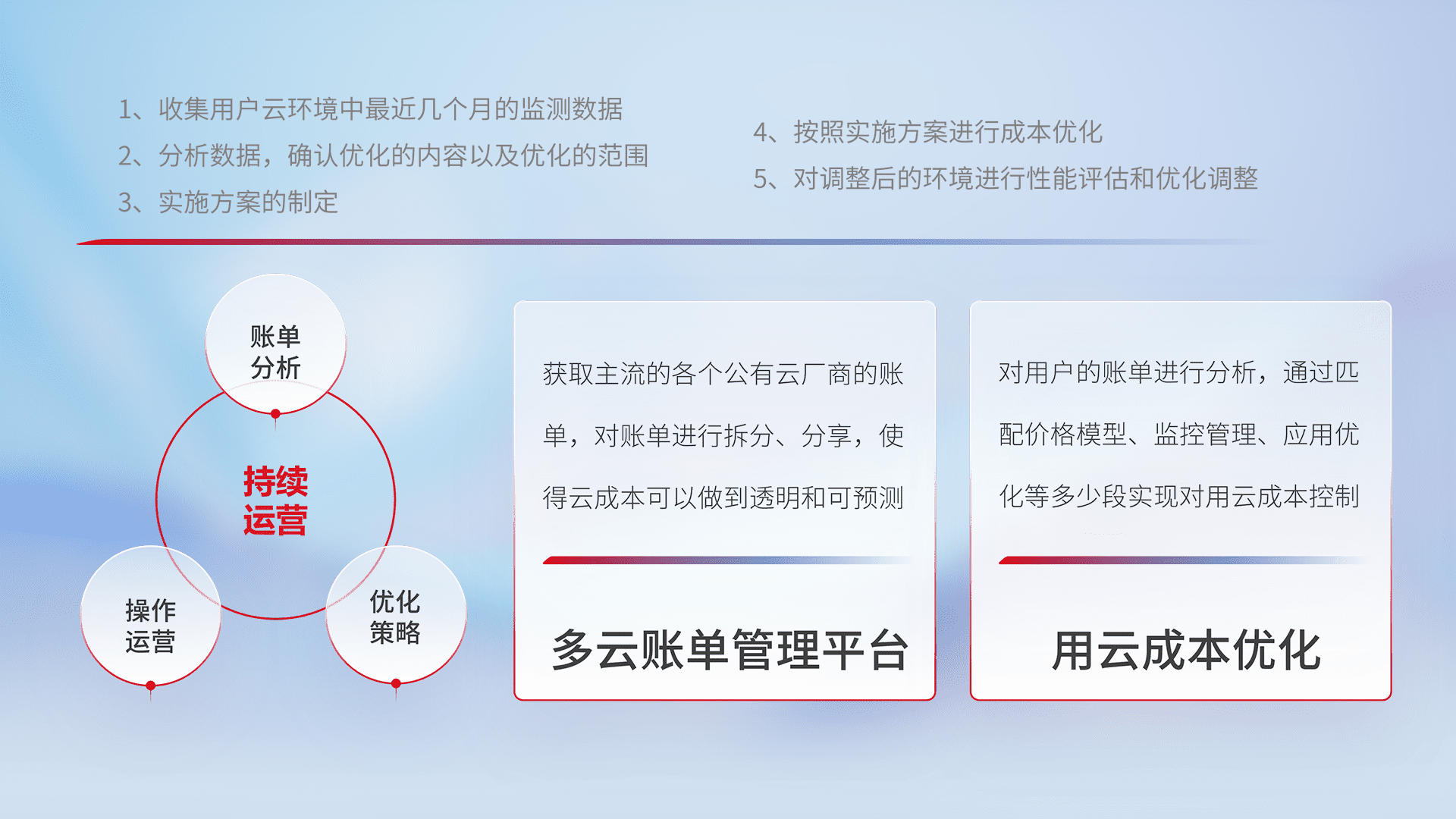 通过灵活运用多种自动化迁移工具,,,帮助企业用户实现业务和数据高效 、、稳定的上云迁移和云上迁移,,,采用自研多云纳管平台,,,,以中立管理模式,,,,解决多组织、、、、多云、、、多运维厂商的复杂关系的管理,,,保证多云平台资源配置的一致性,,,,实时掌控云资源运行数据,,运用智能化工具分析云资源多云平台的管理服务,,,透明化管理成本支出,,,,用云成本可预测、、用云费用可优化、、、、云资源配额有据可依。。。。