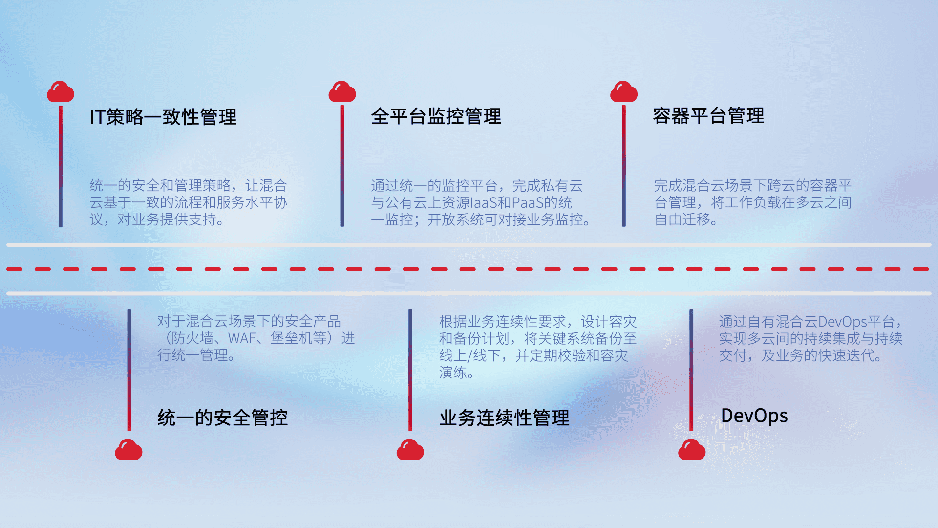 通过多云纳管,,,,以统一的资源数据模型把客户的云资源进行抽象和封装,,,,进而实现对多云资源的统一操作,,保障云资源管理的可靠性、、、稳定性与可用性。。。量身定制化运维内容,,,配置、、开发运维、、补丁管理、、、备份、、、监控、、、、认证和访问管理、、、、审计和日常巡检等,,,保障在用云过程中的可靠度,,稳定度以及高可用率。。。